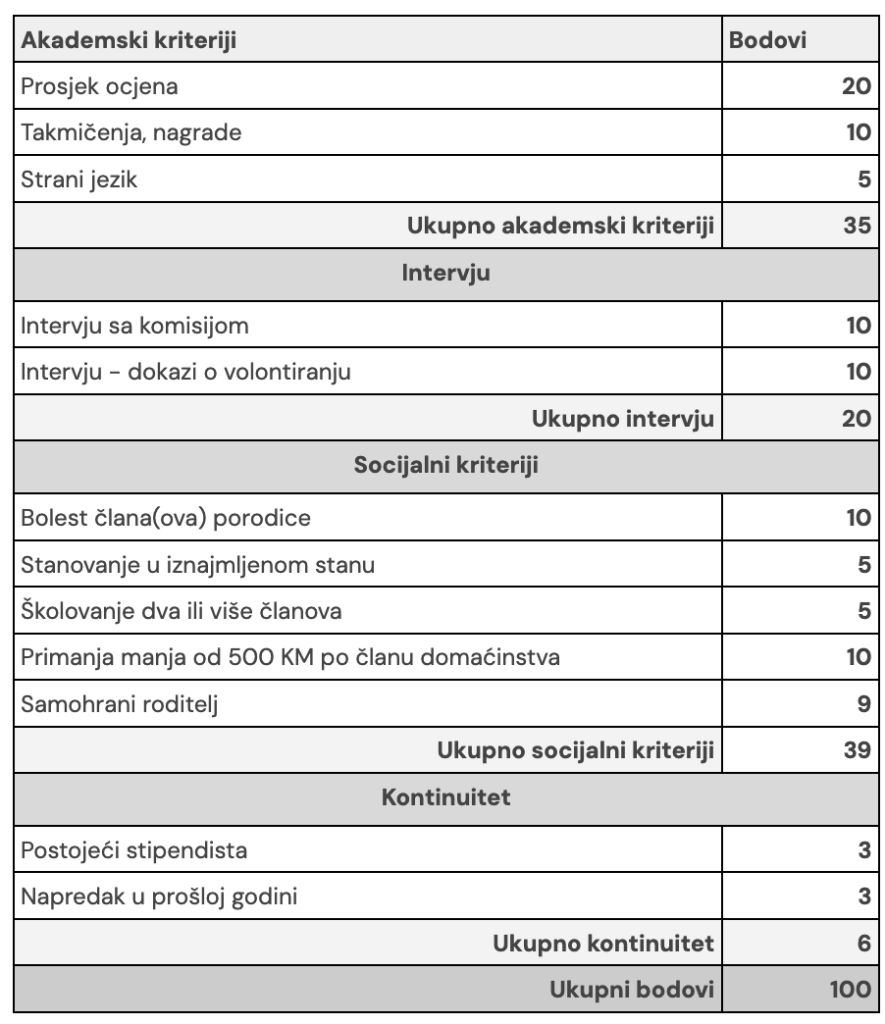 *Boduje se isključivo učešće na takmičenjima, osvojene nagrade i volontiranje iz prethodne i tekuće godine, računajući od datuma objave Javnog poziva. Certifikati i zahvalnice koji se odnose isključivo na prisustvo (bez aktivnog učešća ili osvojenog priznanja) neće biti uzeti u obzir i ne trebaju biti uključeni u prijavu.